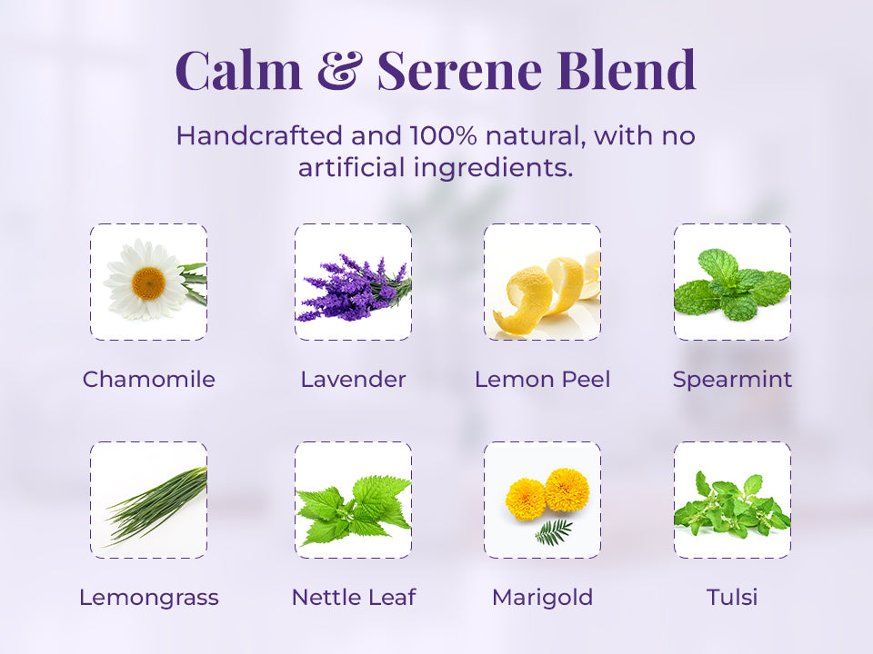Inhale the soothing aroma of The Tranquility Blend - Jivisa's Stress Relief Herbal Tea (Tisane*). Close your eyes, relax and breathe deeply with every sip of this warm cup. A magical blend of caffeine-free traditionally proven calming herbs like Chamomile, Lavender, Lemon Peel, Spearmint, Lemongrass, Nettle Leaf, Marigold and Tulsi. Jivisa's 'The Tranquility Blend' Stress Relief Herbal Tea will definitely help your body unwind and release all the stress trapped within.